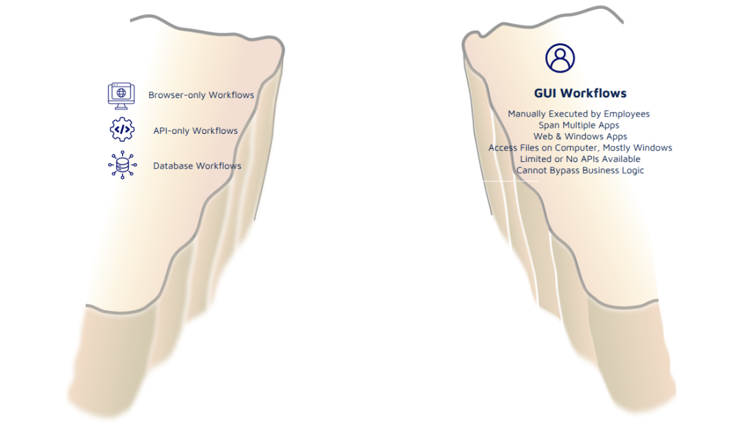 On the other side of the chasm are 80+% of enterprise workflows that are GUI-based. A human uses a computer to manually execute these workflows. These workflows span multiple Web and Windows applications and need access to documents.